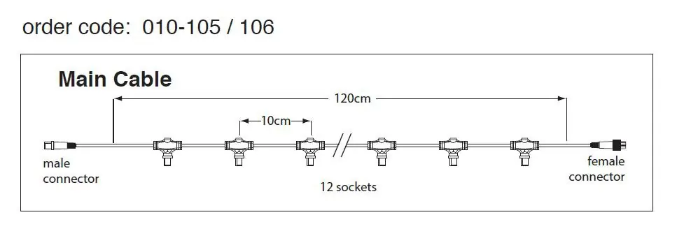 1,20m Hauptkabel Schwarz 230V mit 12 Fassungen für modulare Lichterketten System IP44 Markenprodukt