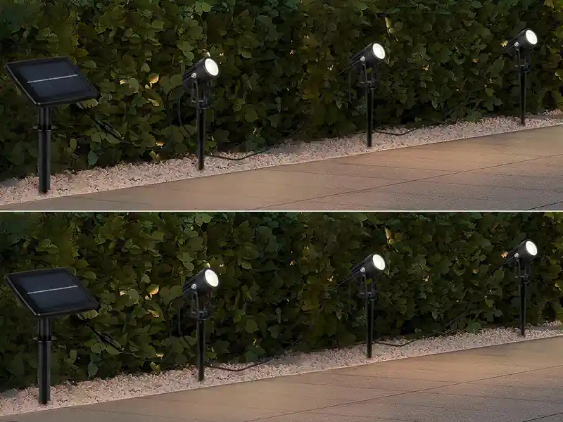 Die Strahler werden über Solarlicht aufgeladen und schalten sich dank des integrierten Dämmerungssensors bei Einbruch der Dunkelheit automatisch ein und sorgen so für eine mühelose Nutzung.
